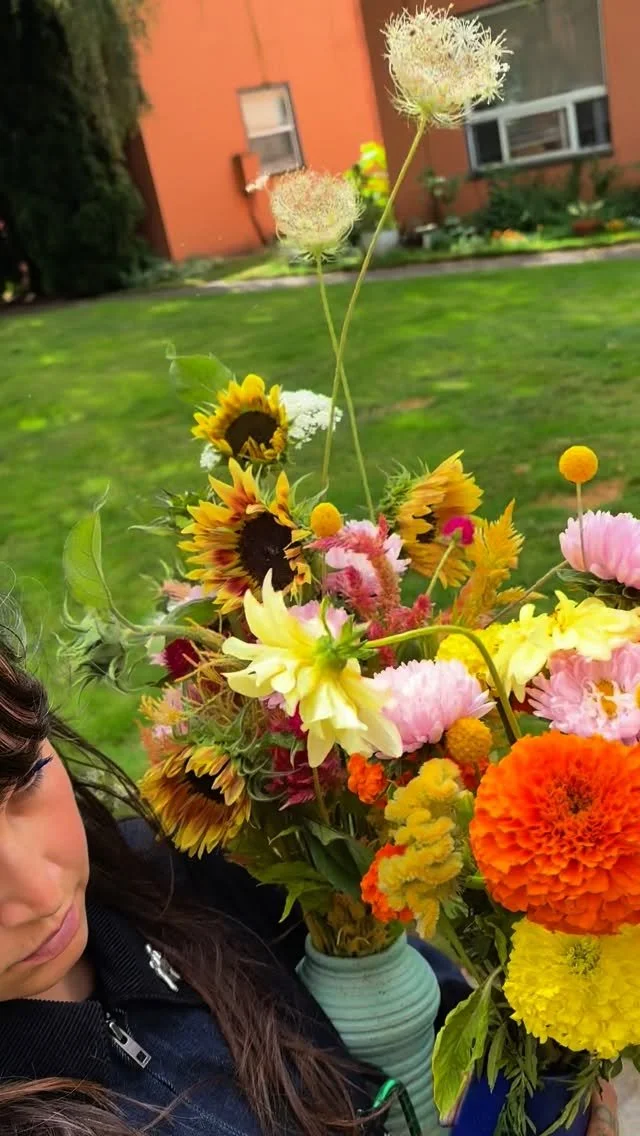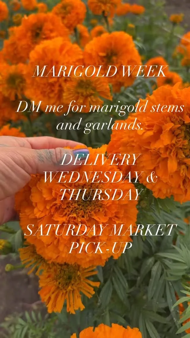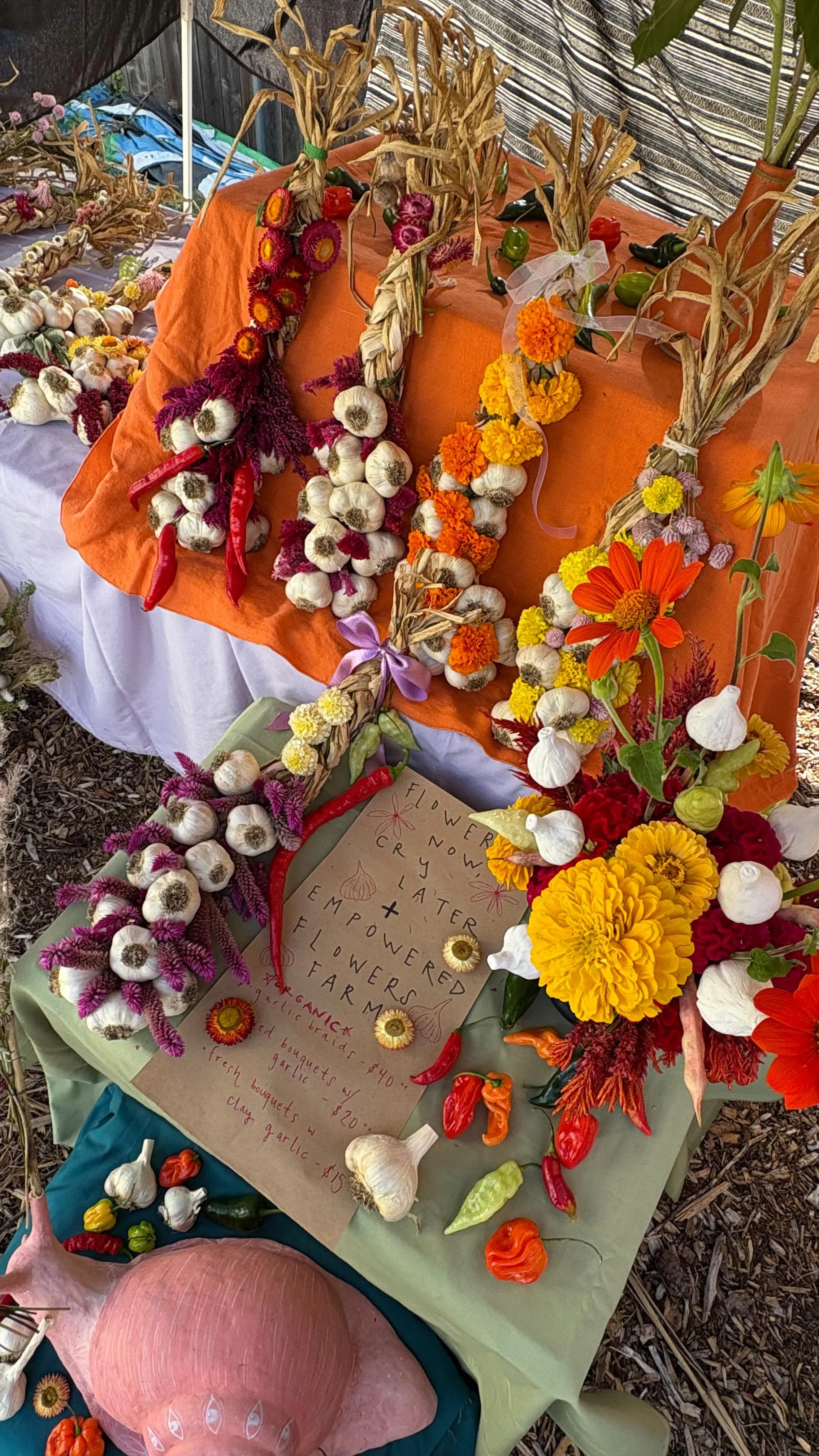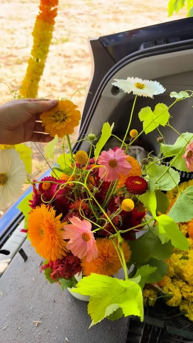 I am an artist in many ways. From oil painting, to water color, to photography and print making. I’ve worked with metal and clay, sculpting, making jewelry…being a chef and a baker. I just HAVE to create and I love doing it. I always say I’m a jack of all trades and a master of none. My Aries Moon fuels me with fire and chaos, carrying me from one project to the next, while my Virgo sun keeps me grounded, detail-oriented, and always striving for perfection. My current journey of growing flowers and arranging them feels so natural. It feels like I have done this before in a past life or maybe even many times before. I feel my Mexican and Indigenous ancestors with me, especially as I string marigold blooms together. I know this is what I’m suppose to be doing right now. I find myself craving for there to be more time in a day and more days in a week so I can work with flowers even more than I am. I dream of flowers and think of flowers. I am consumed and have so much I want to do. I am inspired by my garden and what is growing. Each arrangement becomes a meditation, a moment of deep connection with what’s in season and thriving together in nature. I love watching which blooms last, which fade first, and which transform into something new as they dry—each flower teaching me in its own way. I’ve had many creative chapters: being a cheese chef and running a buisness, having an etsy shop and selling jewelry. Each experience has shaped me, but this journey with flowers has been my favorite yet. I’m forever grateful to AD and Jolene at Empowered Flowers for teaching me how to farm, believing in me and giving me the space to grow flowers at the farm with endless advice and help.